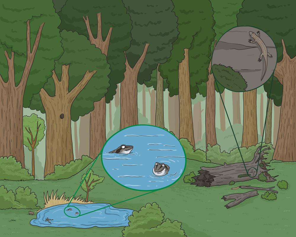 Es ist wahrscheinlich das leise Knattern von Fröschen in Waldteichen zu hören, auf dem Pfad lassen sich eine Blindschleiche oder Grasnatter erblicken die ein Sonnenbad genießen.