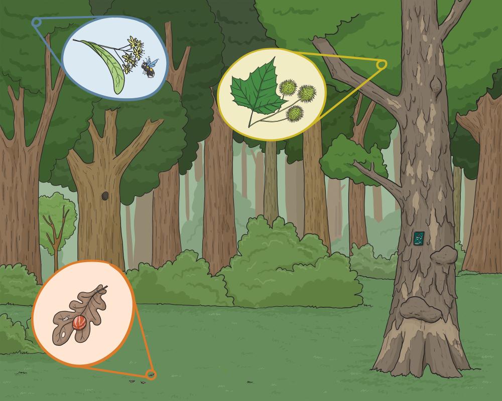 Several tree species of different height form the treestand. The majority is the remains of the natural forest. The dominating species are common oak and ash. Some trees like London planes, chestnuts or larches are non-native to this region and were planted by humans.